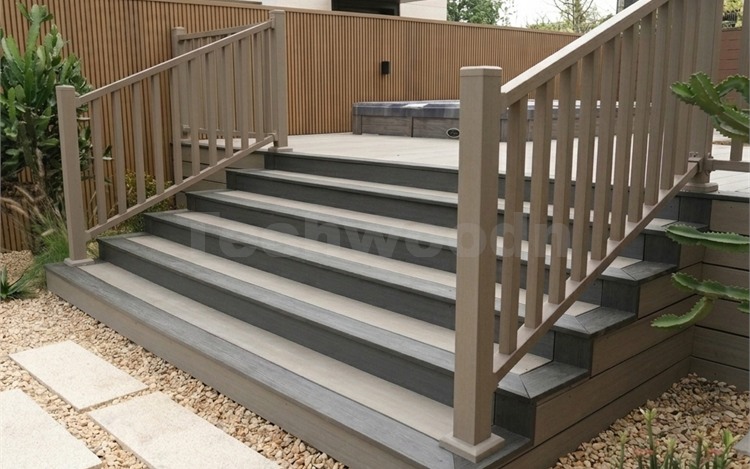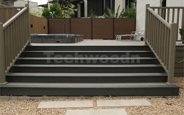 比如在别墅庭院平台项目中,它可以用于连接花园与露台,增强空间过渡的完整性;在别墅露台宽台阶中,它能够强化踏步的层次感和整体视觉秩序;在泳池周边湿区台阶中,木塑材质也更容易与周边 deck、步道和休闲区形成统一风格;在旧楼梯翻新项目中,它还可以作为台阶表层升级材料,让原本普通或老旧的楼梯重新获得更整洁的外观表现。